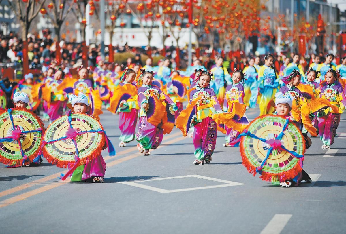 三月三日,元宵节当天,榆阳区陕北民歌非遗传习所少儿秧歌队在“陕北榆林过大年”秧歌展演中。 记者 杨彬 摄