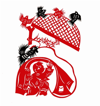 《扣麻雀》 头蒙布衫握紧绳,麻雀绕着筛子飞;半路奔个老公鸡,拽住引绳来搅局。